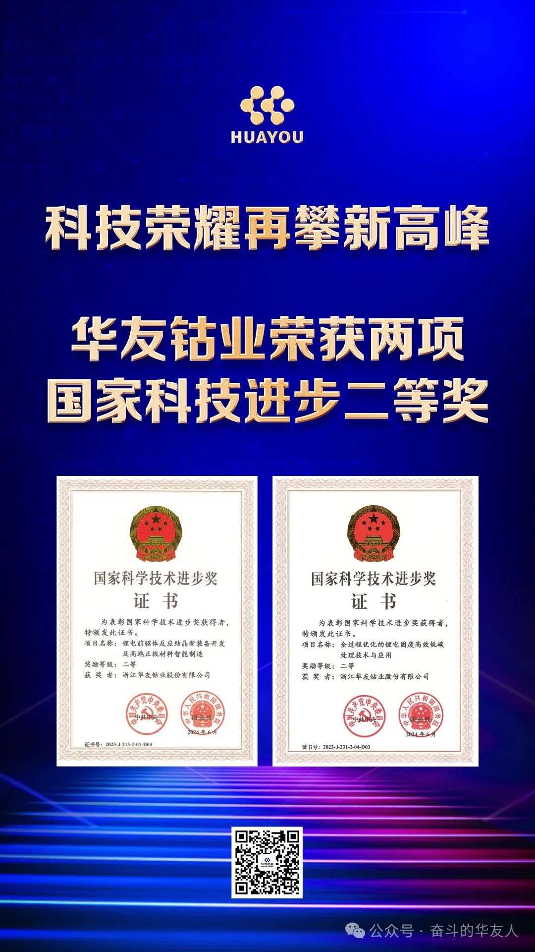 6月24日,2023年度國家科技獎勵獲獎情況揭曉,中國科學院過程工程研究所主導、華友參與的2項科研成果——“鋰電前驅(qū)體反應結(jié)晶新裝備開發(fā)及高端正極材料智能制造”、“全過程優(yōu)化的鋰電固廢高效低碳處理技術(shù)與應用”榮獲2023年度國家科學技術(shù)進步二等獎,標志著華友在有色金屬綠色精煉、鋰電材料開發(fā)、資源循環(huán)再生利用領域創(chuàng)新成果再攀新高峰,彰顯了華友在新能源材料技術(shù)革新與可持續(xù)發(fā)展方面的領先地位。